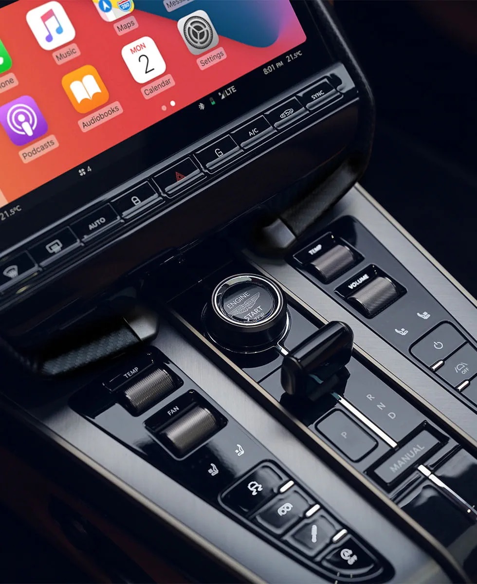 Enter Vanquish’s unique 2-seat cabin, a sanctuary of power and luxury focusing on both driver and passenger. Every control is ergonomically designed, blending digital precision with analogue beauty, featuring exquisite haptic feedback to complement its advanced digital architecture. The dashboard amplifies the feeling of space and immersion, while Vanquish’s design principle emphasises a seamless surge of power and muscularity, linking the engine directly with the interior environment.